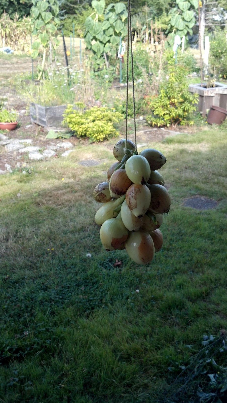 Sunflower heads consists of many individual flowers. The left one has them removed. Those our our onions in the back right. I am curing them in the garage right now.